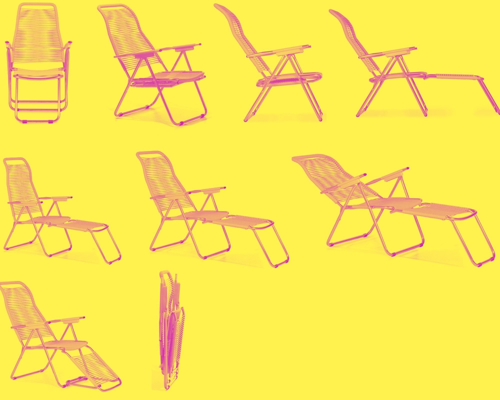 Spaghetti è regolabile in 5 posizioni ed è dotata di poggiapiedi a scomparsa. La cordonatura della seduta è intrecciata a mano in Italia con il caratteristico tondino in PVC.