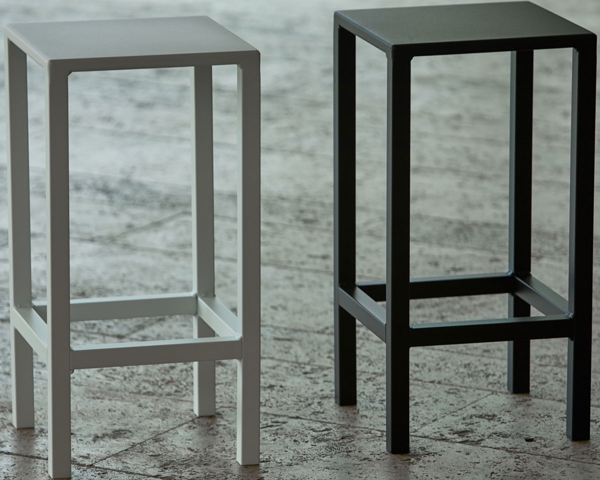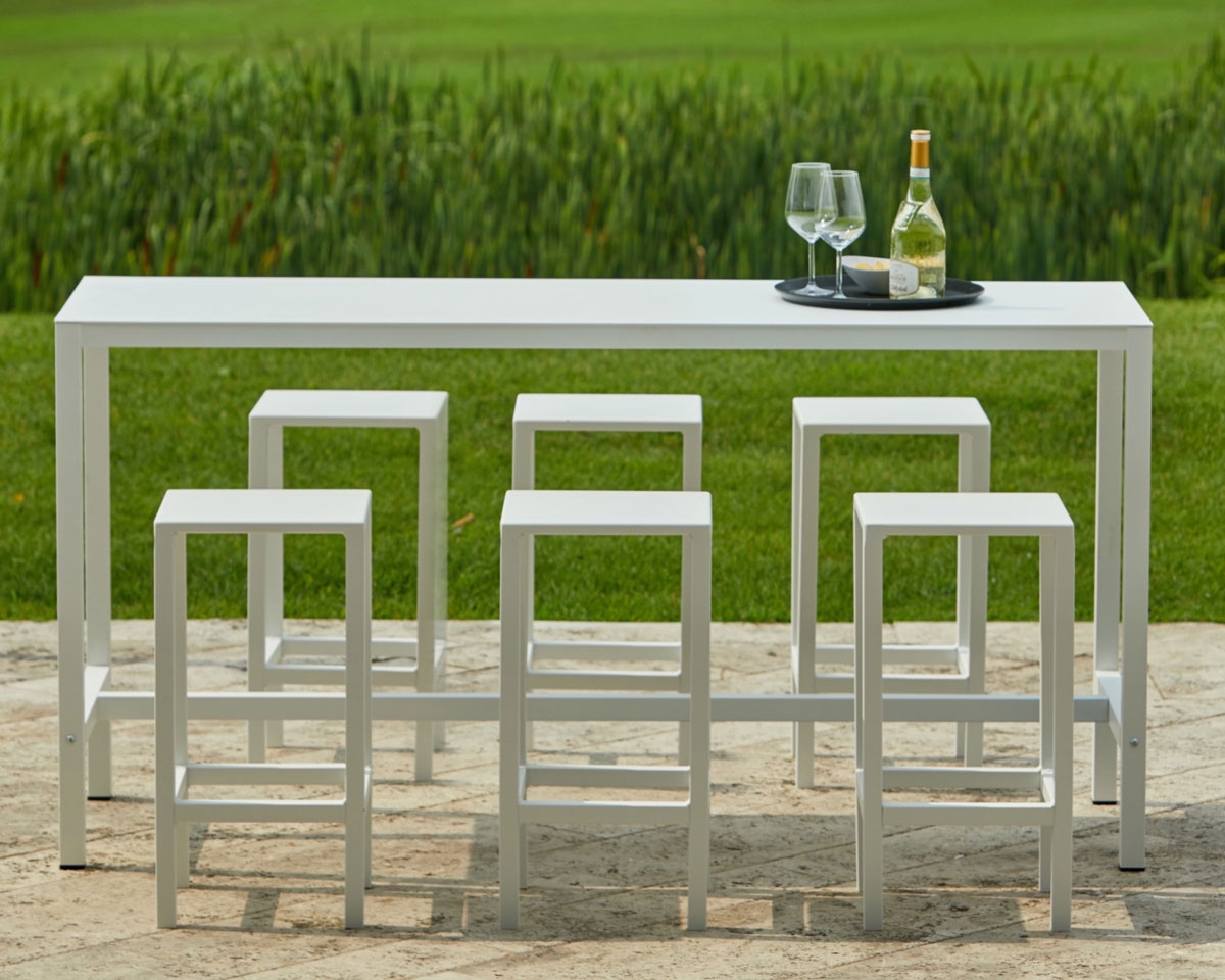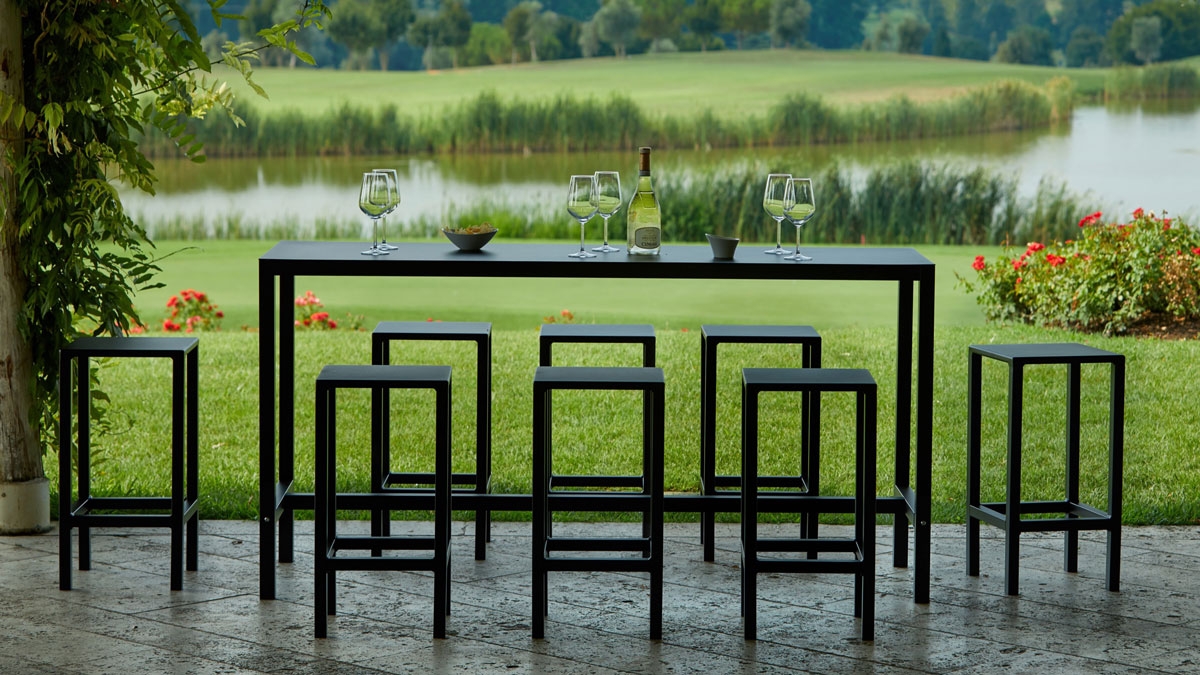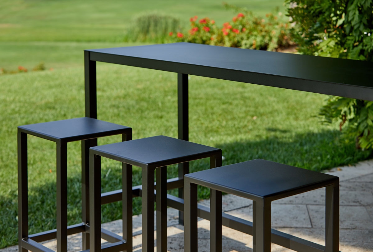 Il piano dei tavoli e dello sgabello è caratterizzato da uno spessore molto sottile di alluminio, infondendo un senso di elegante leggerezza, con il vantaggio di una stabilità ed una resistenza a tutta prova. Le tonalità standard disponibili sono: il bianco, l' antracite ed il nero, ma possono essere verniciate su richiesta. Pensato per ogni situazione outdoor può essere un tavolo molto versatile e si adatta a svariate situazioni nell’ indoor.