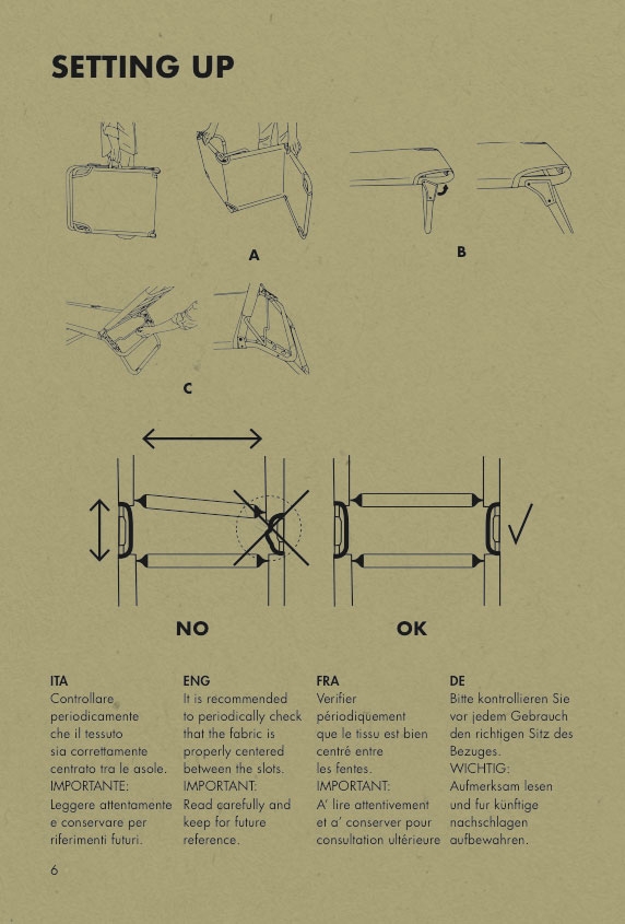 Oltre alla scelta del materiale per la sua leggerezza o durata, si raccomanda l’utilizzo di prodotti con telaio in Ferro verniciato per uso in erba o su pavimentazioni non delicate (potrebbe fuoriuscire acqua rugginosa dall'interno dei tubi se lasciati alle intemperie).